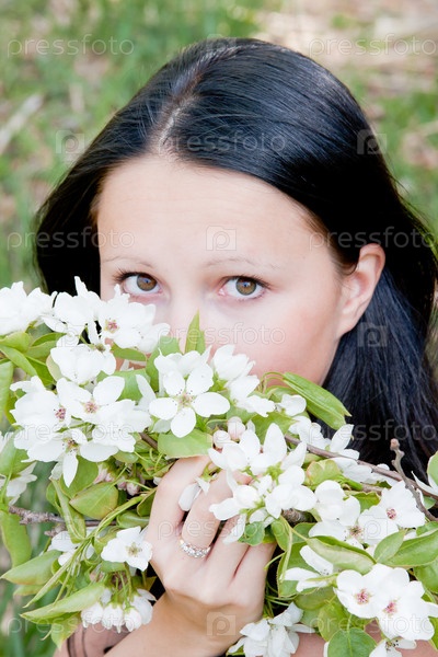Темноволосая девушка с букетом цветущих ветвей на природе
