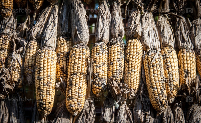 Кукурузные початки сохнут на свежем воздухе