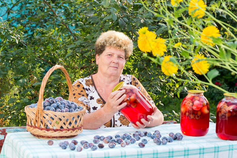 Женщина с компотом из слив в саду