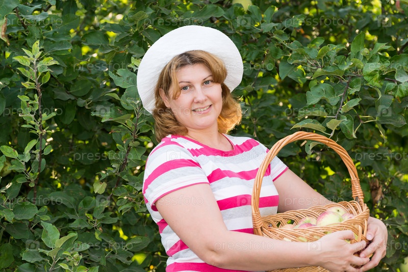 Женщина с корзиной яблок в саду