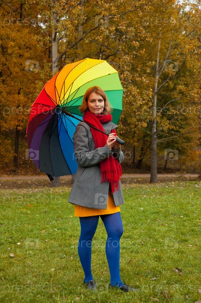 Женщина с цветным зонтом в осеннем парке