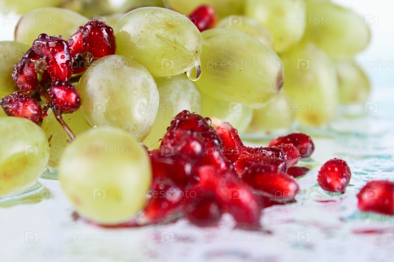 Виноград с гранатовыми зернами на стекле, удаленном вблизи