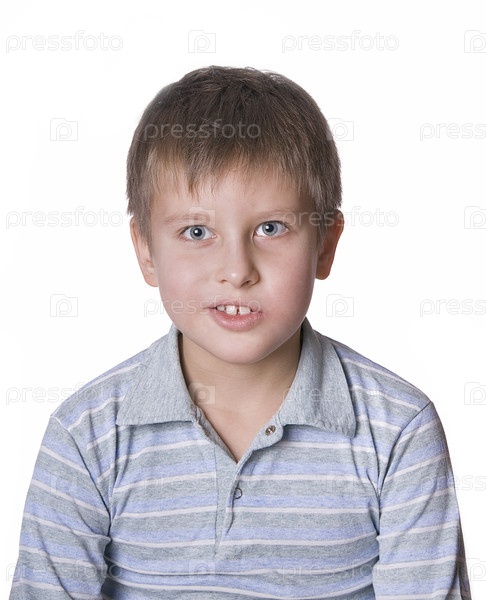 Фото очаровательного молодого мальчика, смотрящего на камеру над белым