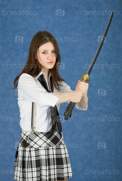 Девушка-подросток угрожающе размахивает мечом на синем фоне