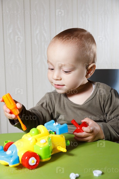 Маленький мальчик ремонтирует игрушечный автомобиль