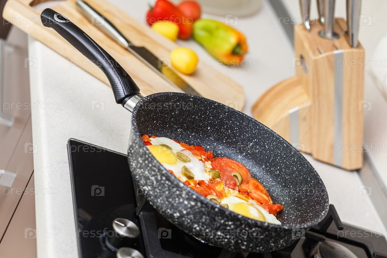 Сковорода с яйцами и помидорами