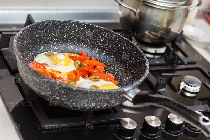 Сковорода с яйцами и помидорами