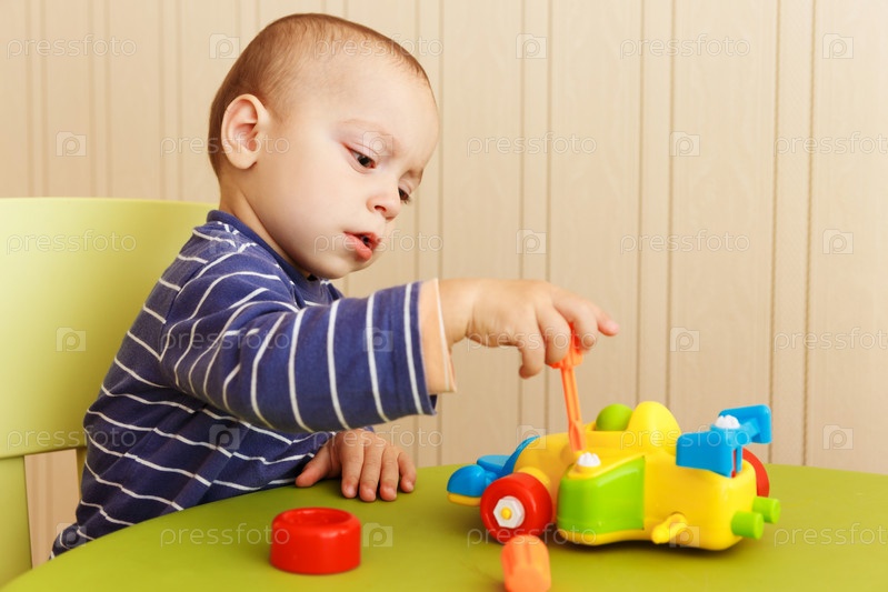 Маленький мальчик ремонтирует игрушечный автомобиль