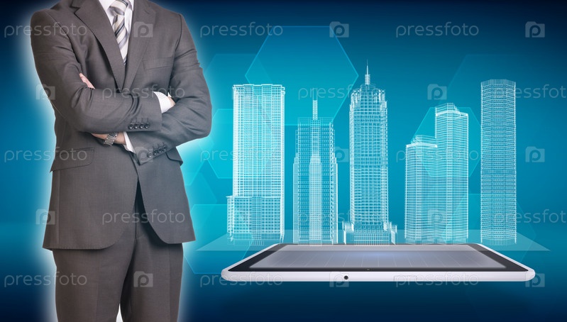 Бизнесмен и здания на голубом фоне