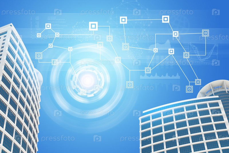 Небоскребы на фоне неба с символами и элементами