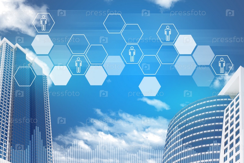 Небоскребы на фоне неба с символами и элементами