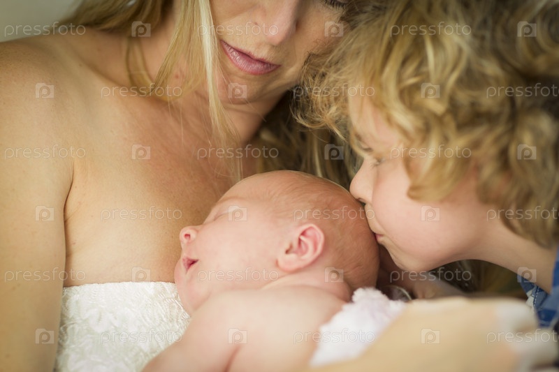 Мальчик целует новорожденную сестру