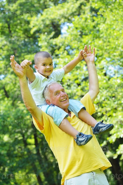 Счастливый дедушка с внуком в парке