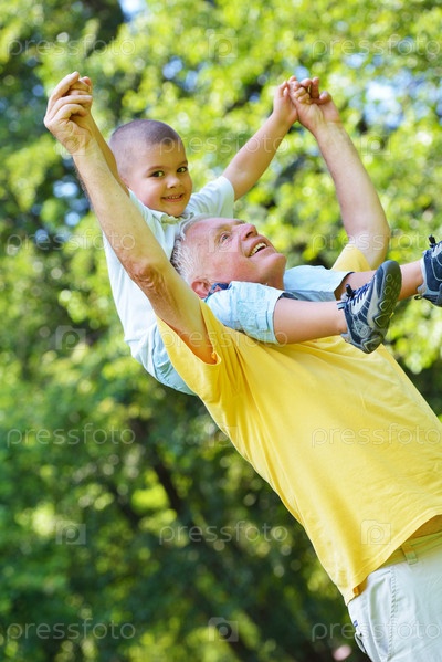 Счастливый дедушка с внуком в парке