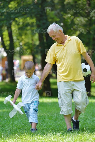 Счастливый дедушка с внуком в парке