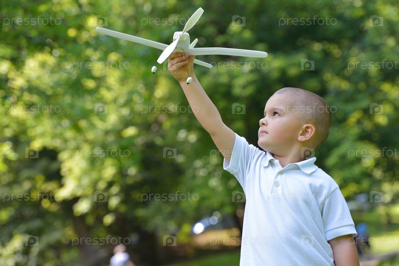 Мальчик с моделью самолета в парке