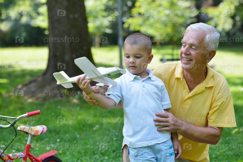 Счастливый дедушка с внуком в парке