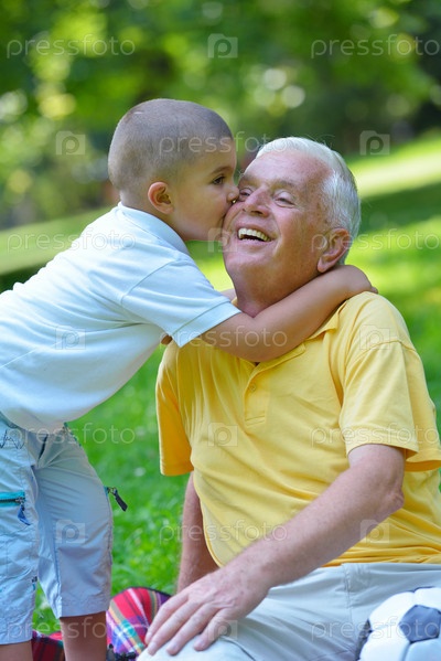 Счастливый дедушка с внуком в парке