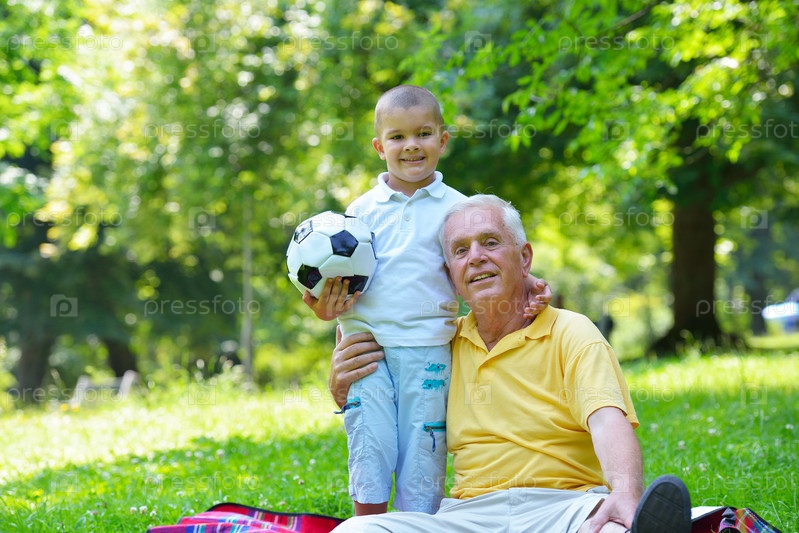 Счастливый дедушка с внуком в парке