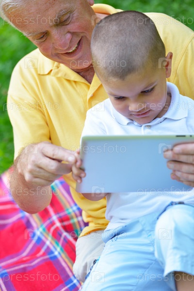 Счастливый дедушка с внуком в парке