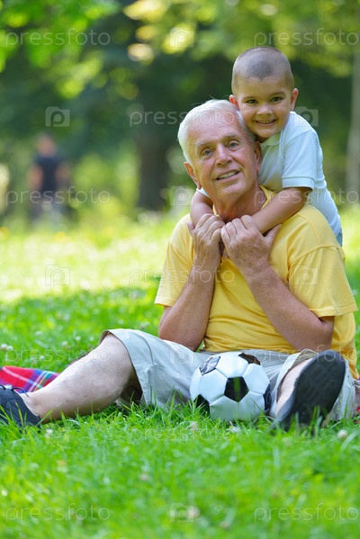 Счастливый дедушка с внуком в парке