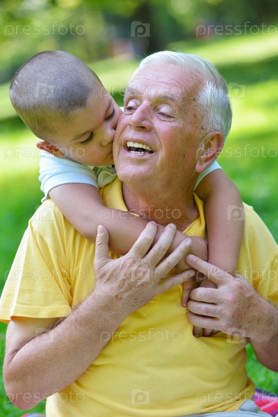 Счастливый дедушка с внуком в парке