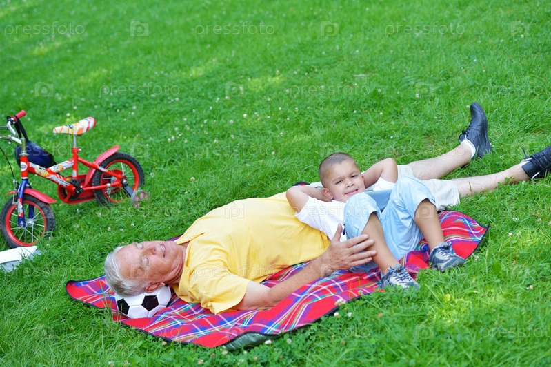 Счастливый пожилой мужчина с мальчиком в парке