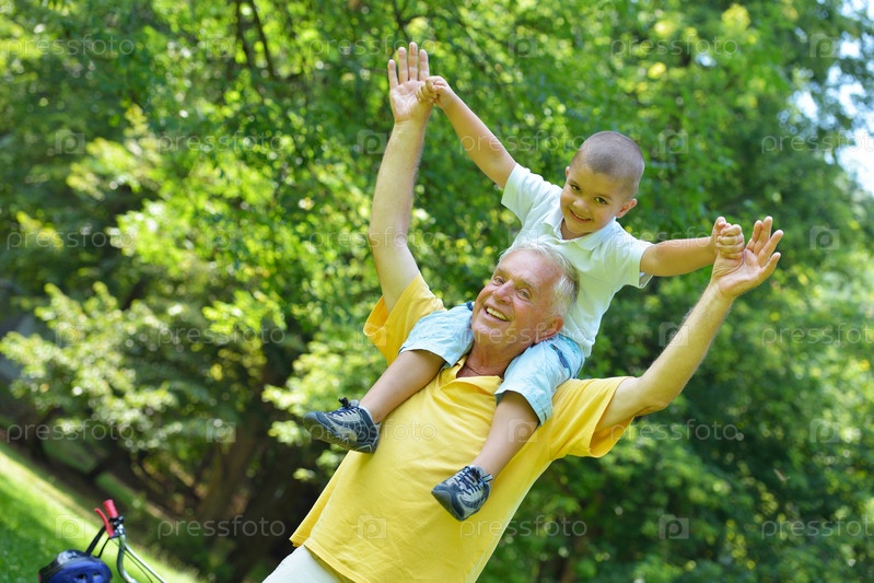 Счастливый дедушка с внуком в парке
