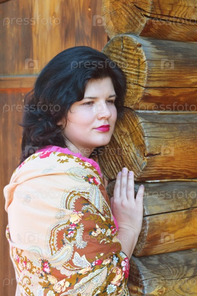 Красивая женщина в платке у деревянного дома