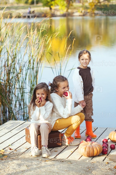 Дети на берегу озера осенью