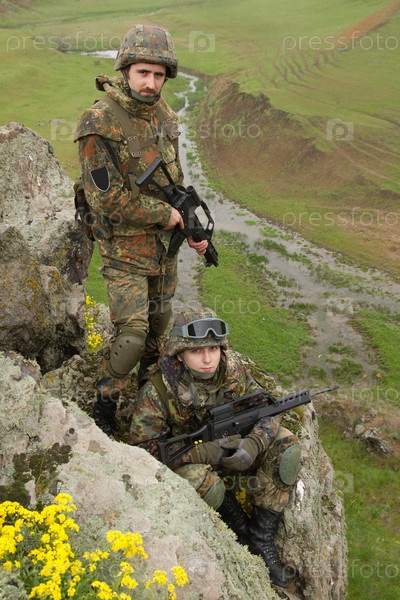 Два солдата в тяжелой боевой экипировке, стоящих в горах на страже
