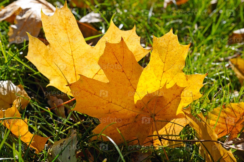 Желтые кленовые листья на зеленой траве