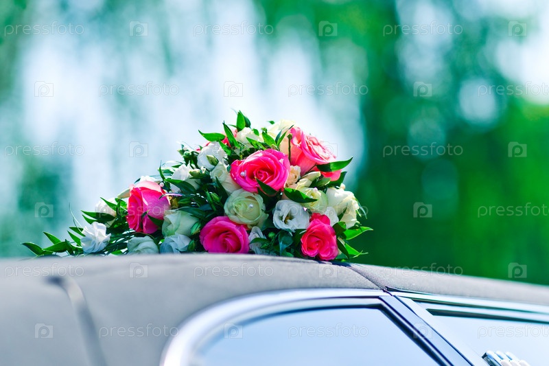 Букет роз на крыше свадебной машины