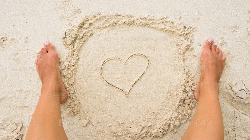 Женские ноги и рисунок сердца на песке