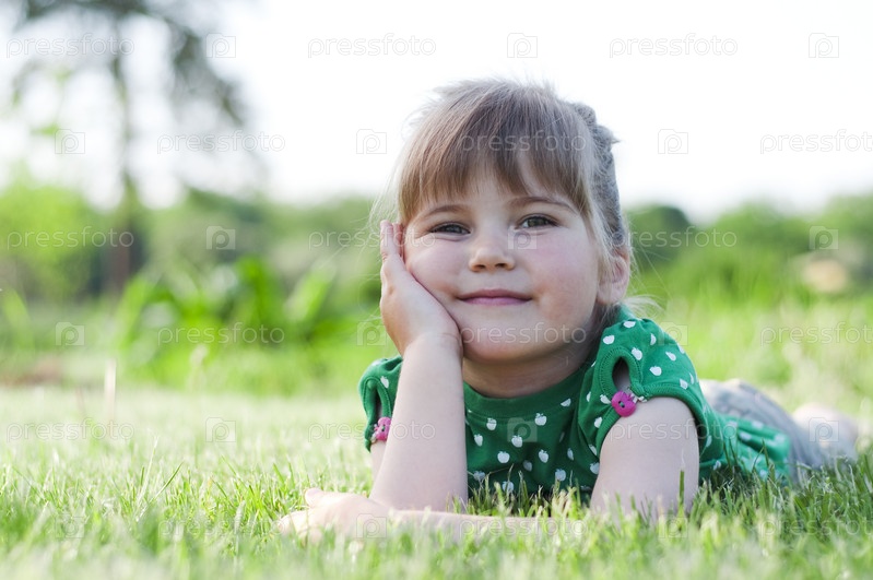 Маленькая девочка на зеленой траве в парке