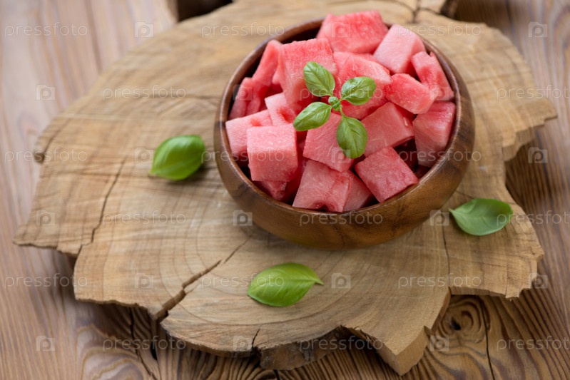 Деревянная чаша с кубиками арбуза крупным планом