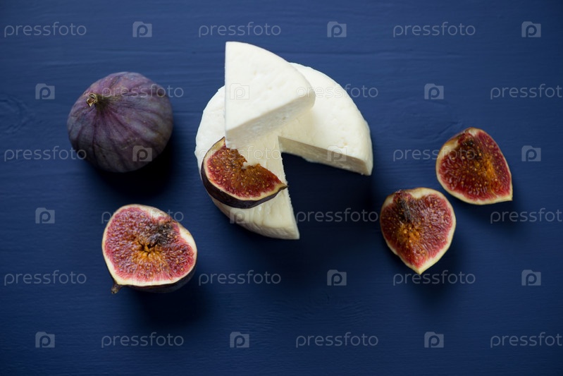 Нарезанный сыр и инжир, темно-синий деревянный фон