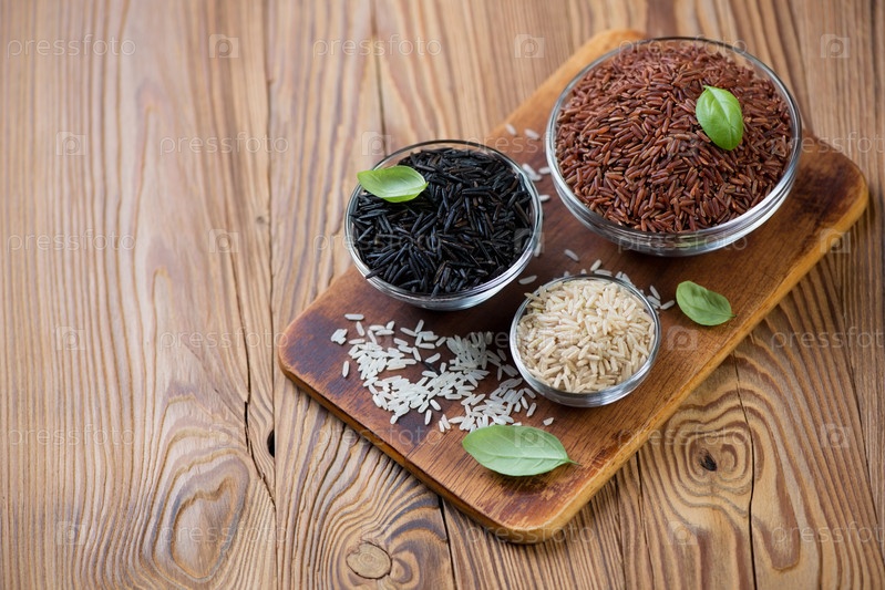 Красный, коричневый, белый и черный рис в чашках