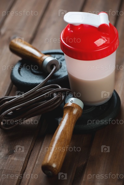 Протеиновый коктейль, скакалка и диски для штанги