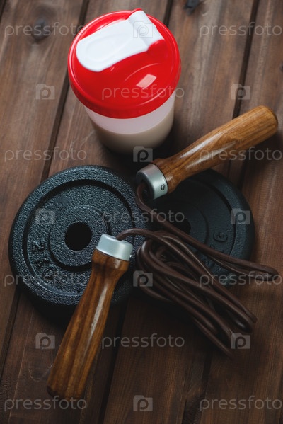 Протеиновый коктейль, скакалка и диски для штанги