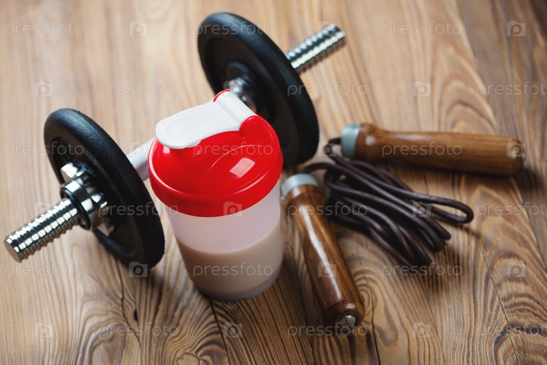 Шейкер с белковым коктейлем, гантели и скакалка