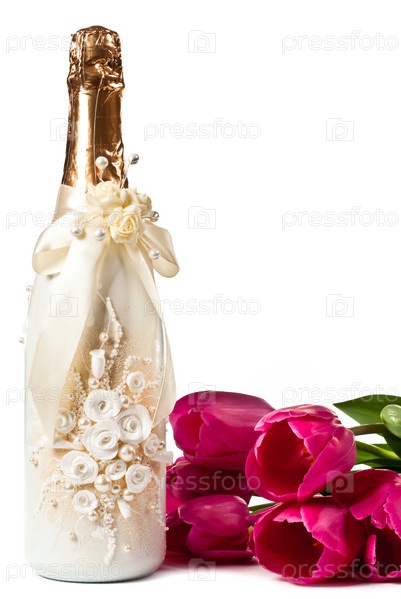 Красивая бутылка шампанского с тюльпанами