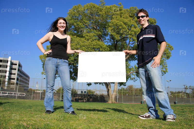 Молодая пара держит пустой белый рекламный щит на улице