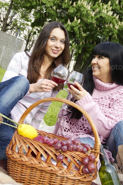 Мать и дочь пьют вино на открытом воздухе