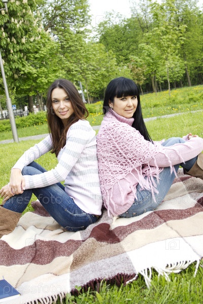 Мама и дочка сидят на пледе в парке