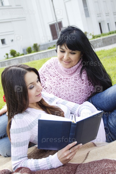 Мама и дочка читают книгу в парке