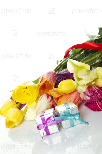Букет из тюльпанов и две маленькие подарочные коробки