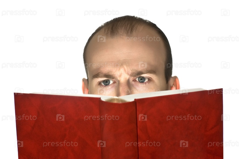 Человек читает толстую книгу, изолированную на белом