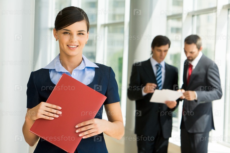 Портрет уверенной в себе женщины, смотрящей на камеру с коллегами по работе на заднем плане