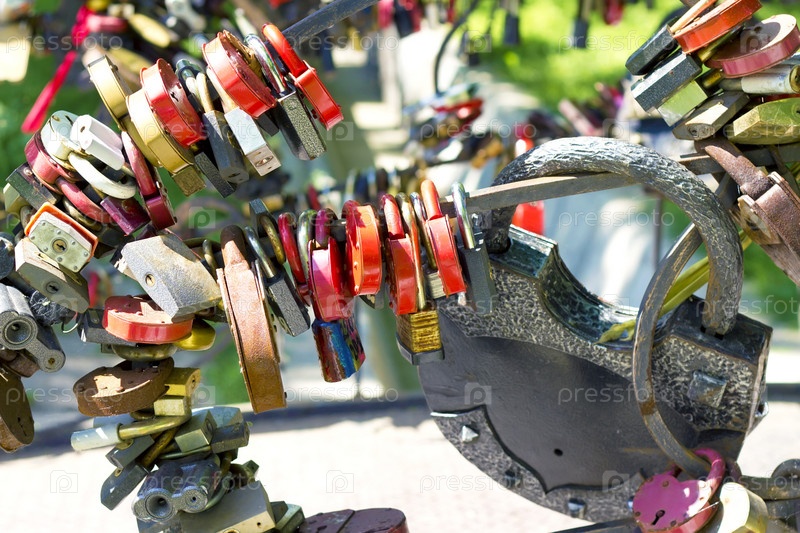 Куча разноцветных навесных замков на перилах